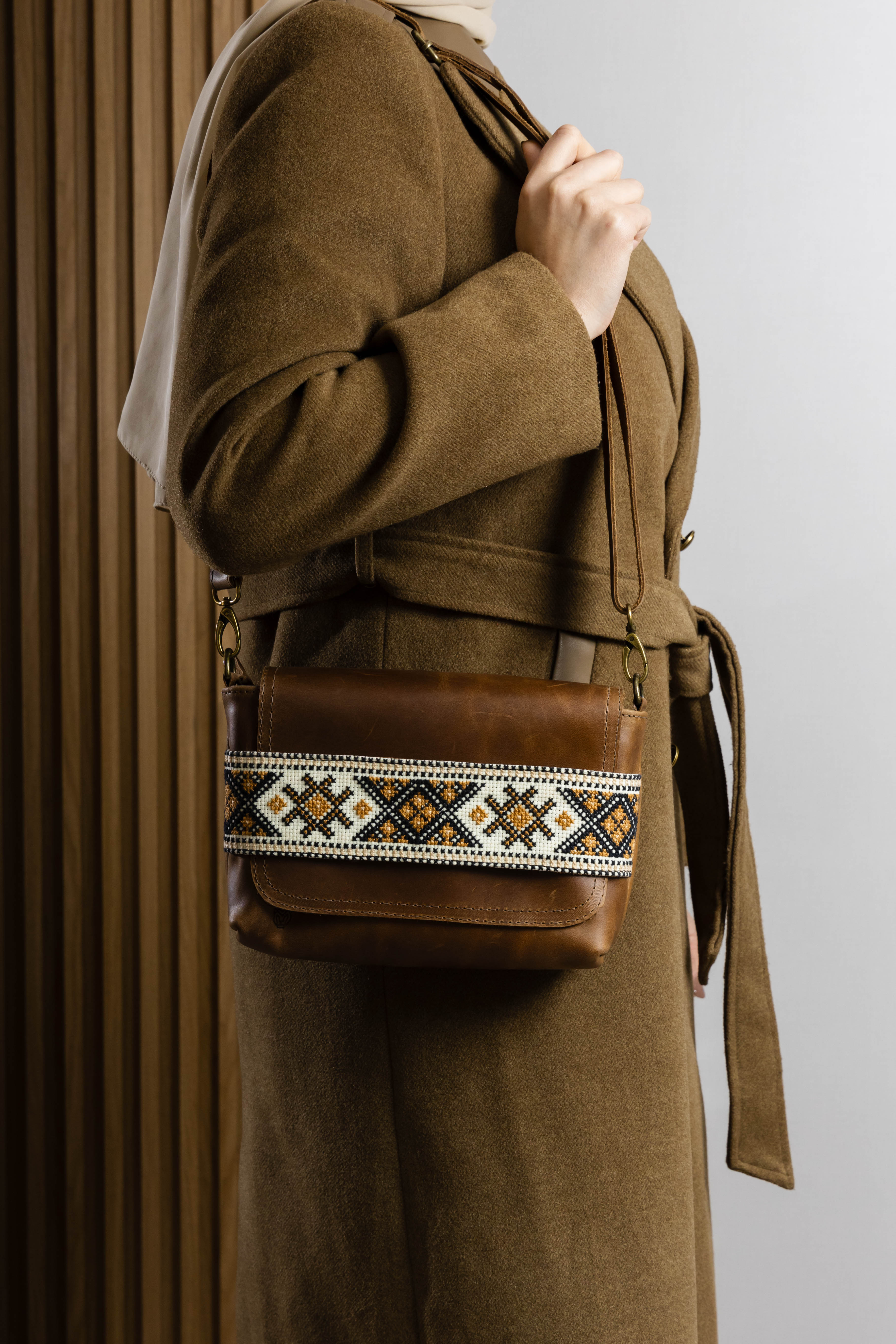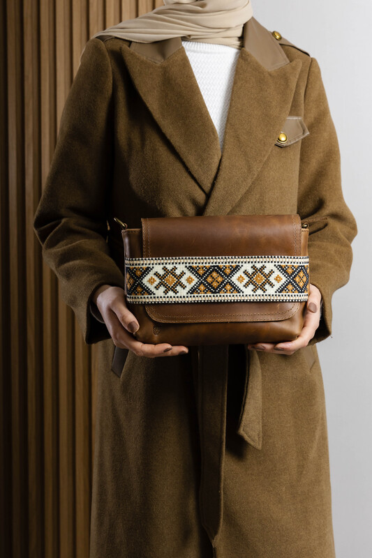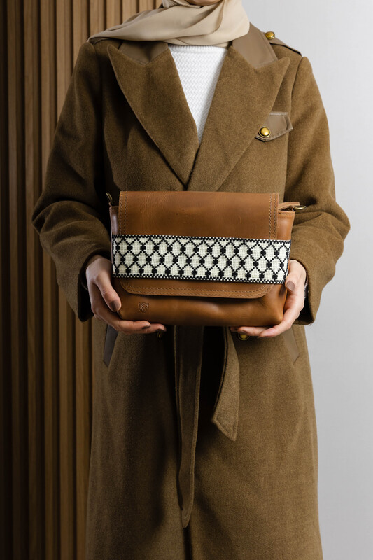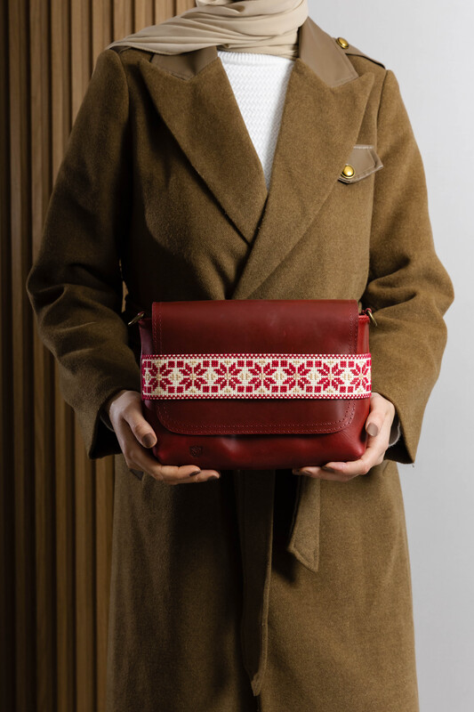 تمتعي بالفخامة حقيبة مصنوعة من الجلد الطبيعي الفاخر، مُطرزة يدوياً بأيادٍ فلسطينية مبدعة تجمع بين عراقة التراث والتصميم العصري.