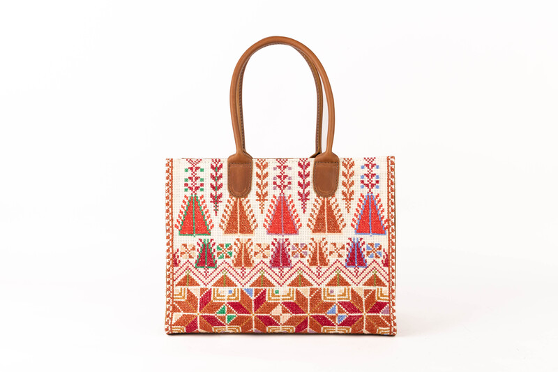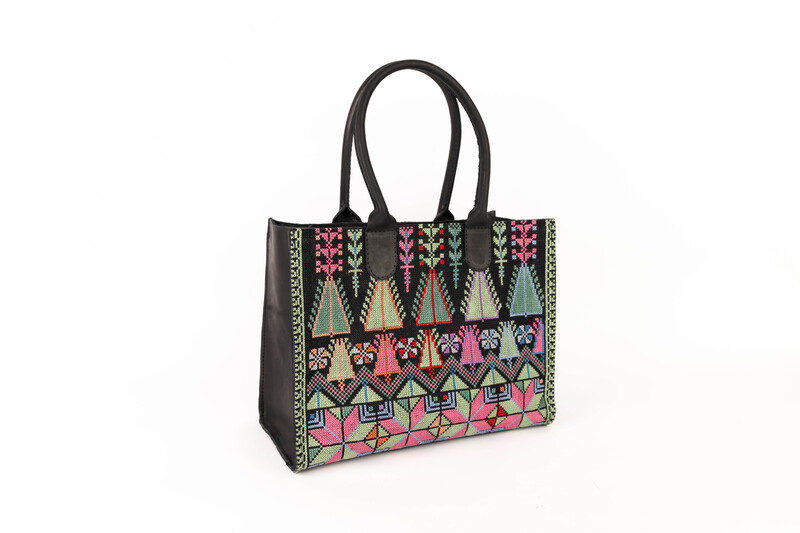 شنطة مطرزة بايدي نساء فلسطينيات صناعة فلسطينية يدوية من الجلد الطبيعي مخاطة بعناية واتقان --توت باج --
