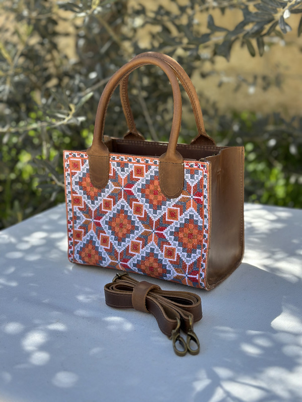 حقيبة مصنوعة يدوياً من الجلد الطبيعي 100%، صُممت لتكون أكثر من مجرد إكسسوار؛ فهي قطعة فنية تحمل في طياتها حكايا الجدات وتراثنا العريق، مشغولة بتطريز يدوي كامل على الوجه بأيدي أمهر السيدات الفلسطينيات.