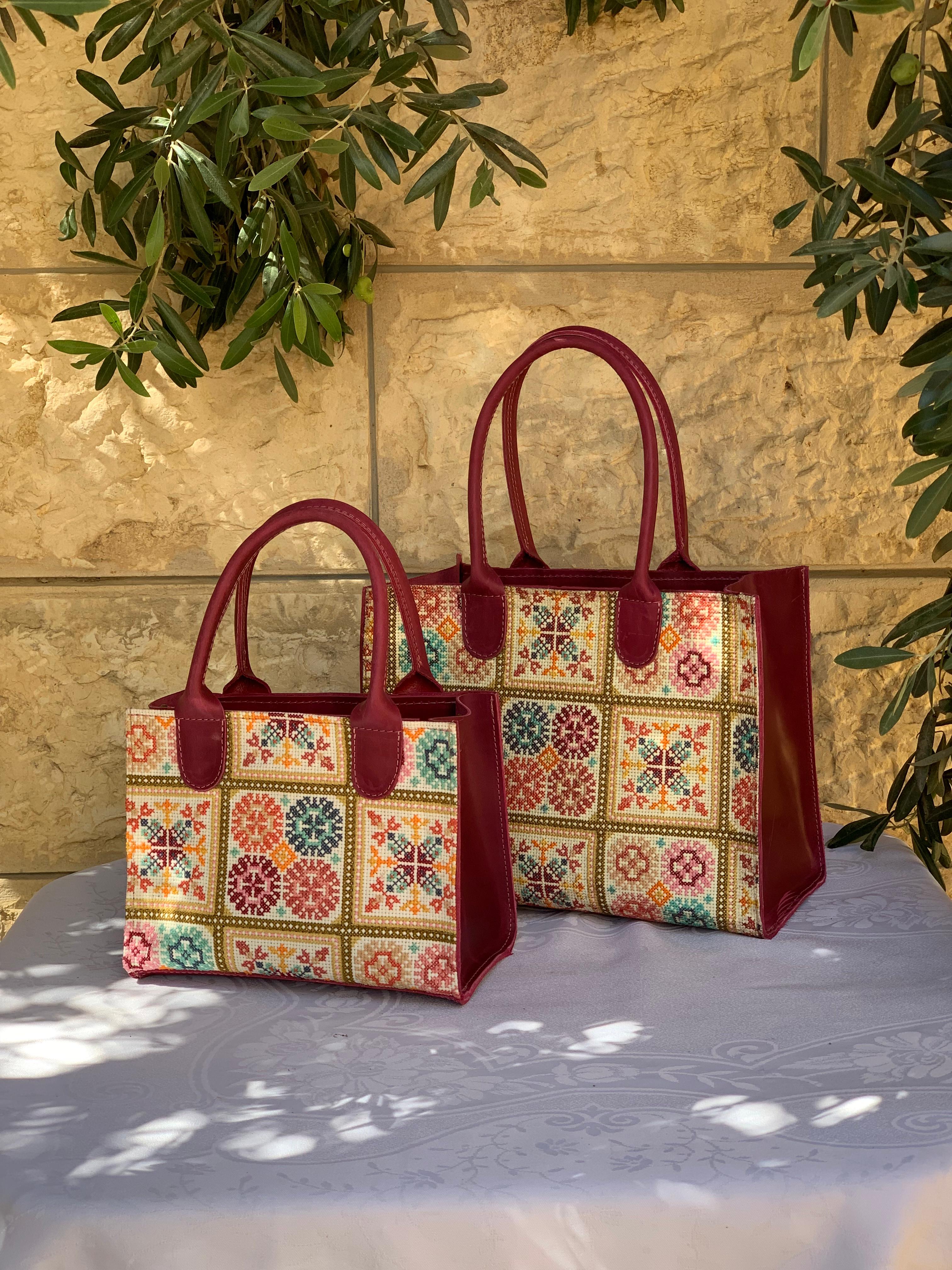 حقيبة مصنوعة من الجلد الطبيعي 100% مع تطريز يدوي أنيق ، مصممة بأيادي فلسطينية بإمتياز