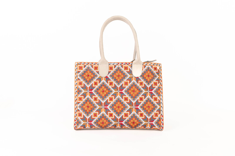 حقيبة مصنوعة من الجلد الطبيعي 100% مع تطريز يدوي أنيق ، مصممة بأيادي فلسطينية بإمتياز