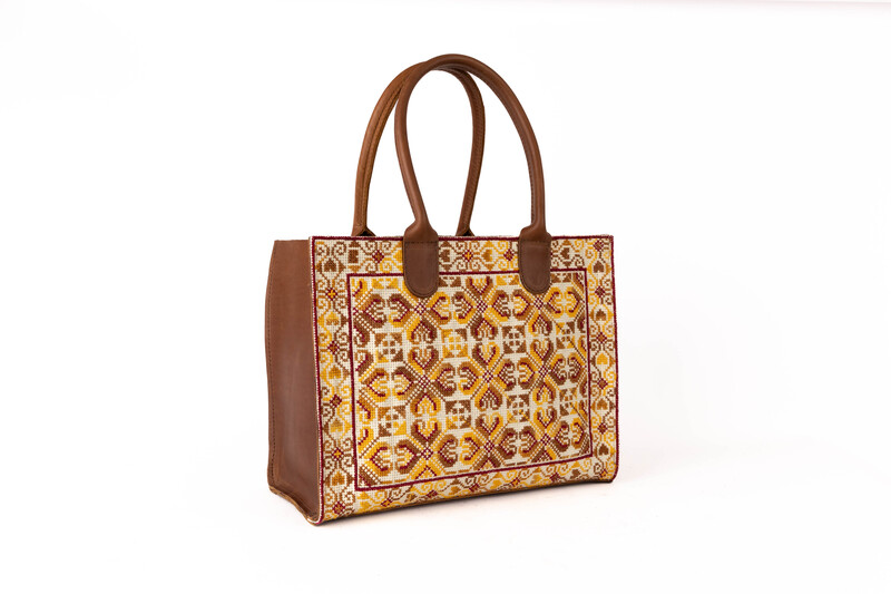 حقيبة مصنوعة من الجلد الطبيعي 100% مع تطريز يدوي أنيق ، مصممة بأيادي فلسطينية بإمتياز