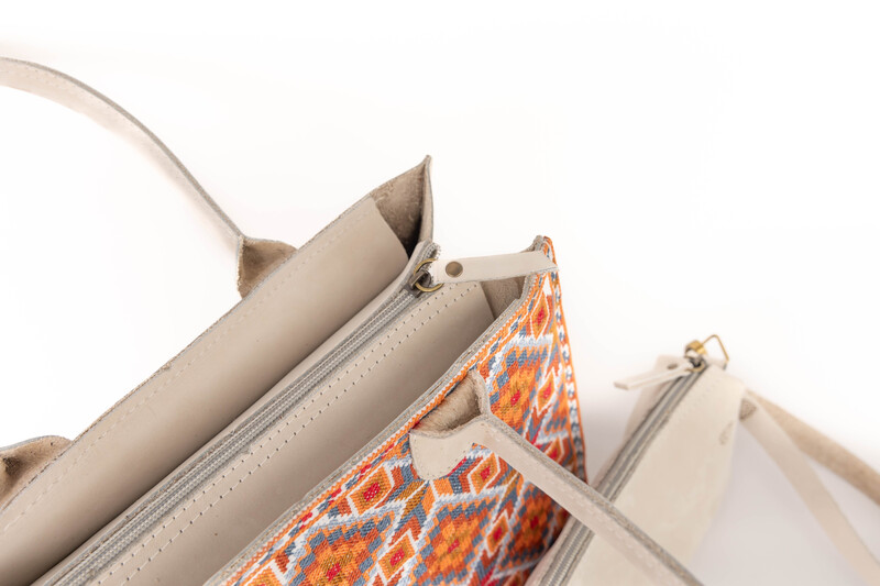 A bag made of 100% genuine leather with elegant hand embroidery, expertly designed by Palestinian craftsmen, It closes with a zipper to protect your belongings, it comes with a small internal bag to help you organize all your essentials, It is available in a variety of colors and shapes to suit your refined taste
