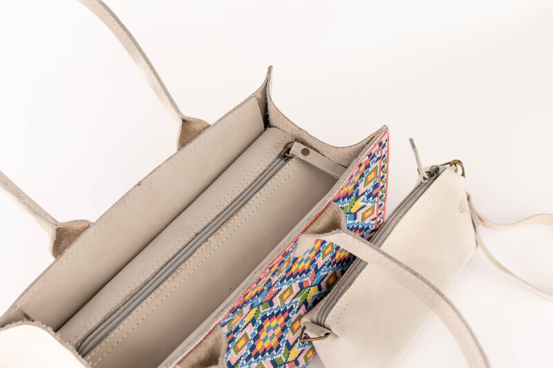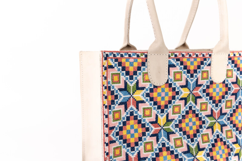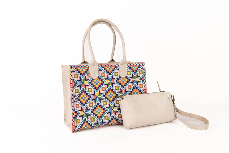 A bag made of 100% genuine leather with elegant hand embroidery, expertly designed by Palestinian craftsmen, It closes with a zipper to protect your belongings , it comes with a small internal bag to help you organize all your essentials , It is available in a variety of colors and shapes to suit your refined taste
